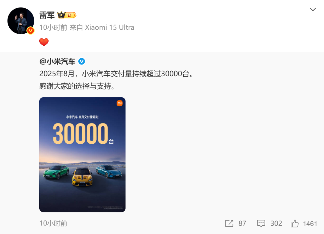 具体来看,小米汽车宣布,8月的交付量持续超过3万辆。雷军也在今天转发小米汽车微博庆祝。
